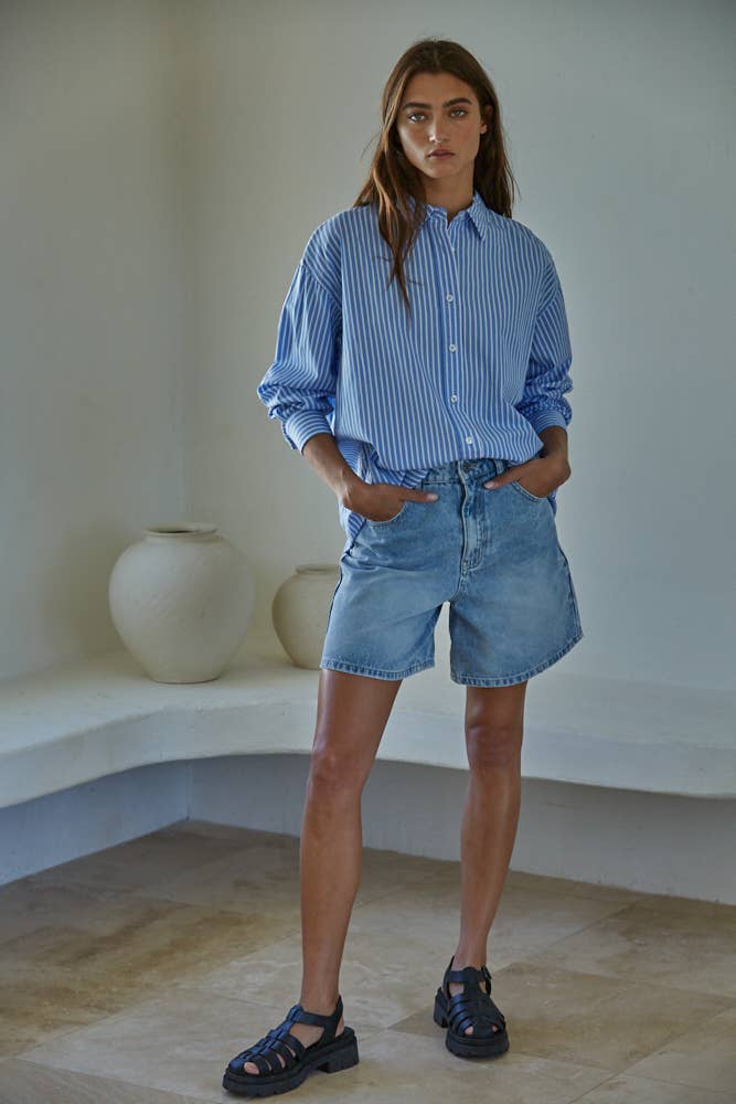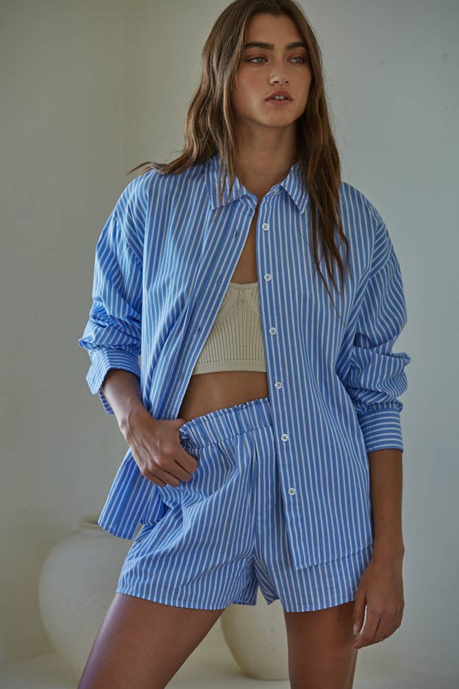 Woven Cotton Striped Button Down Collar Neck Long Sleeve Shirt Top (Optional Set Style - CHRISTIE BOTTOM)