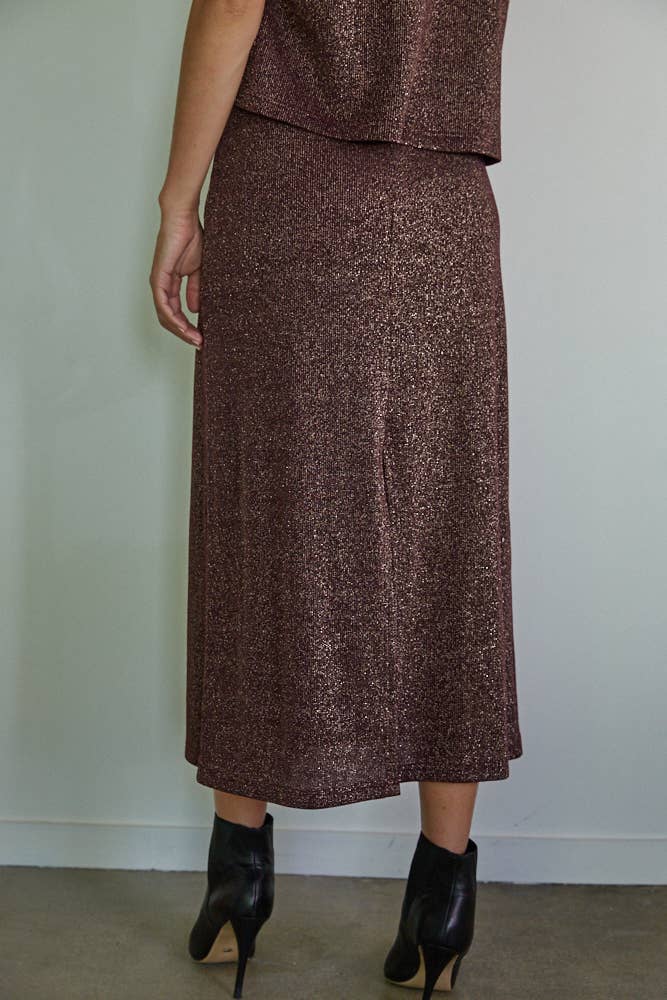 Knit Polyester Spandex Lurex Flare Midi Skirt With Back Slit With Lining