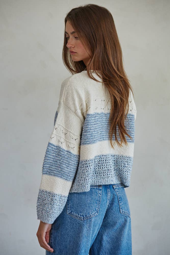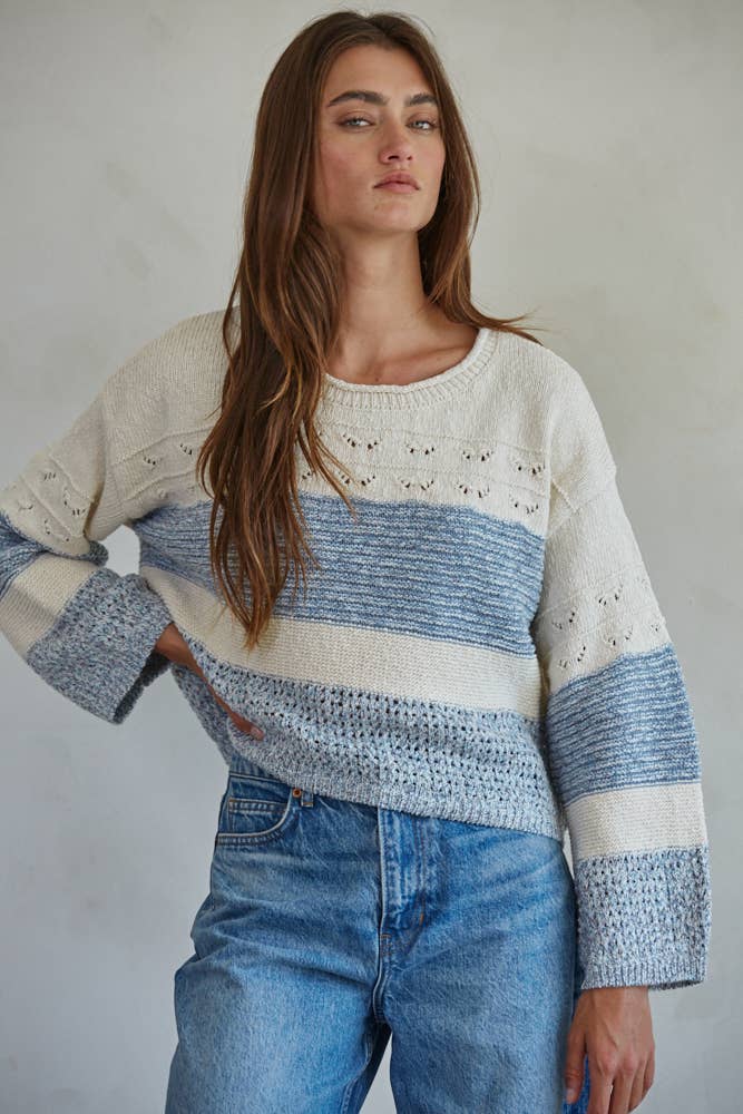 Obsessed! This cozy and stylish knit sweater is perfect for adding a touch of warmth and texture to your wardrobe. The round neckline, long sleeves, and relaxed fit create a comfortable and casual look. The color-blocked design with horizontal stripes adds a touch of interest and visual appeal. The knit construction with a combination of textures and patterns offers a unique and eye-catching look. Crafted from a blend of 60% Cotton, 20% Acrylic, 14% Polyester, and 6% Nylon, this sweater is both soft and durable. True to size