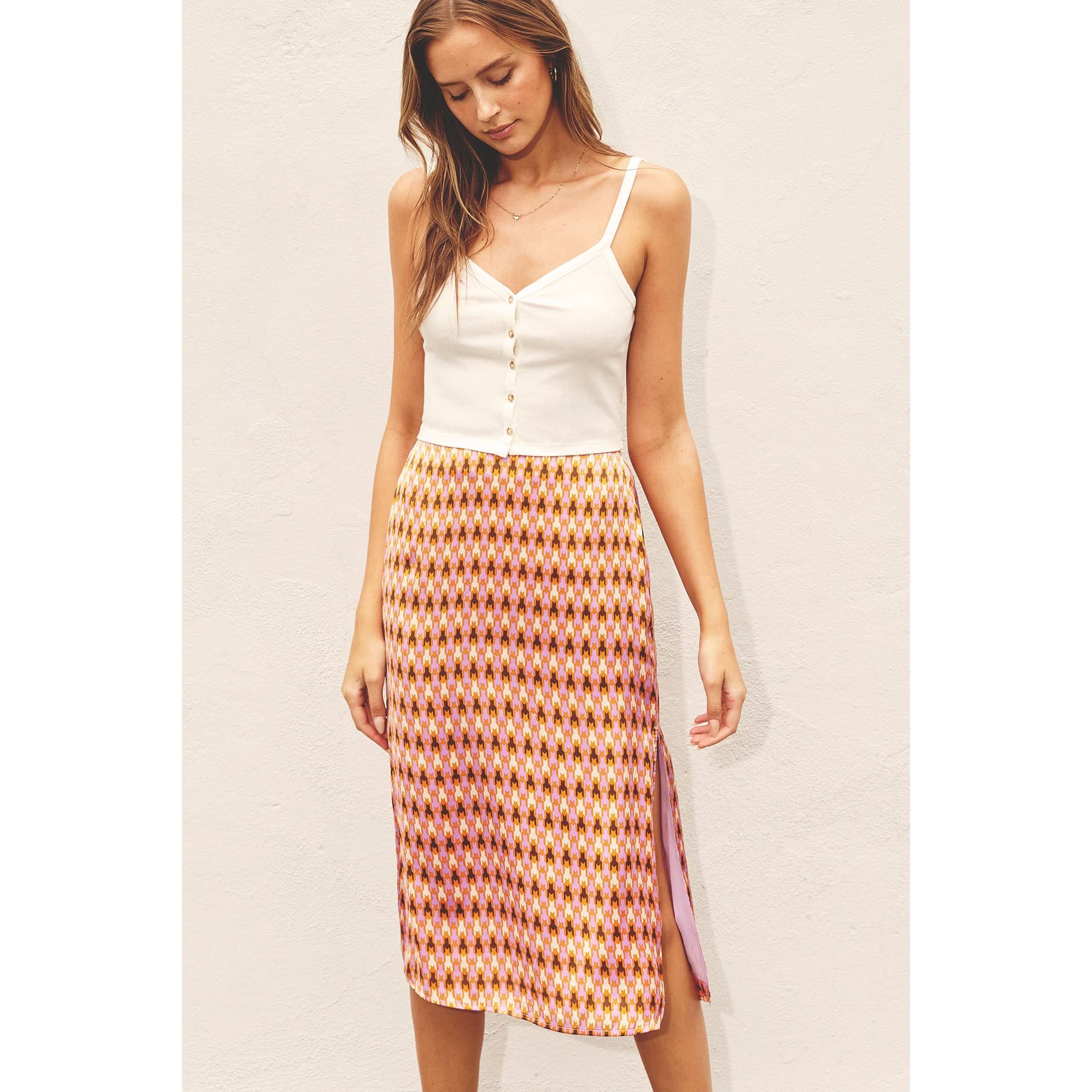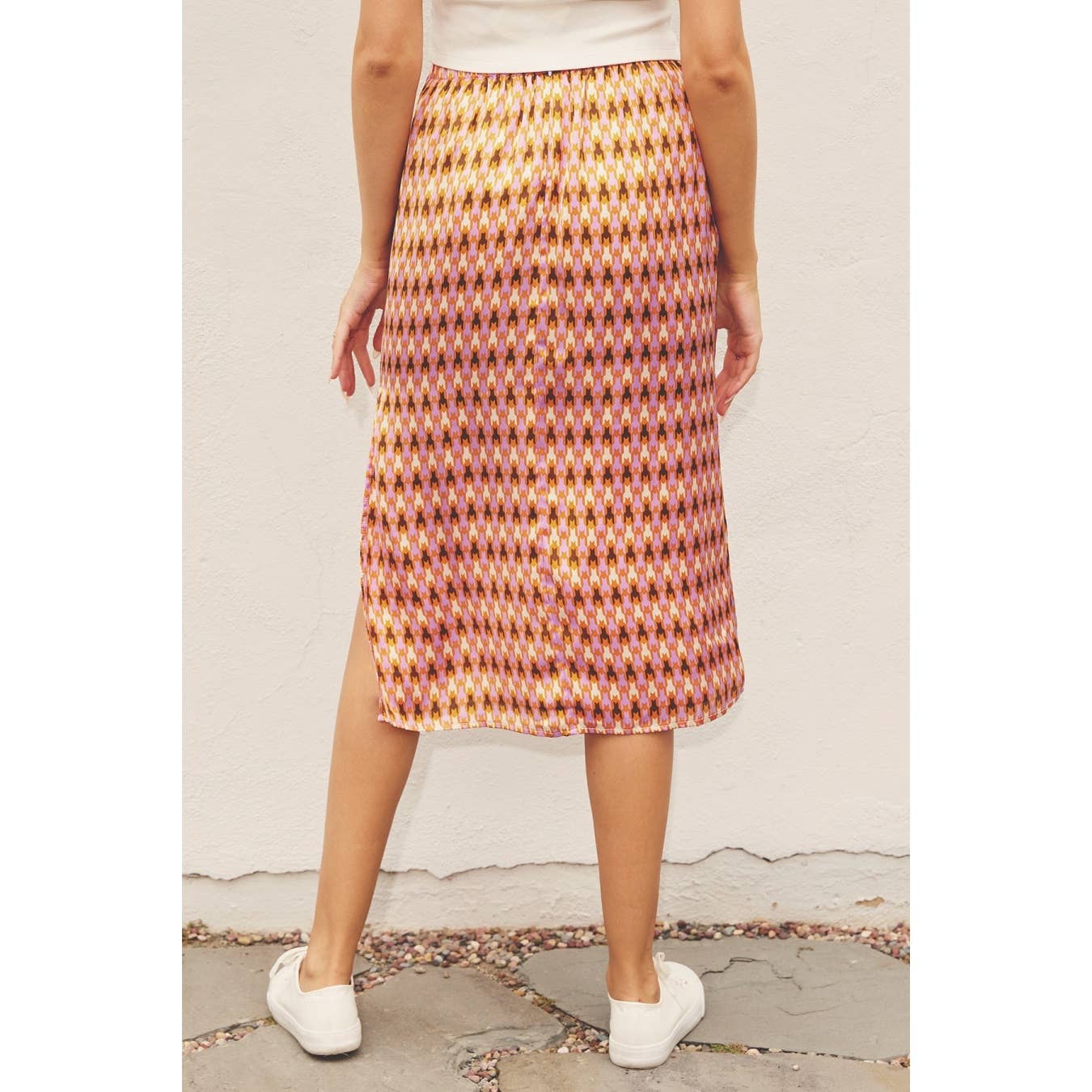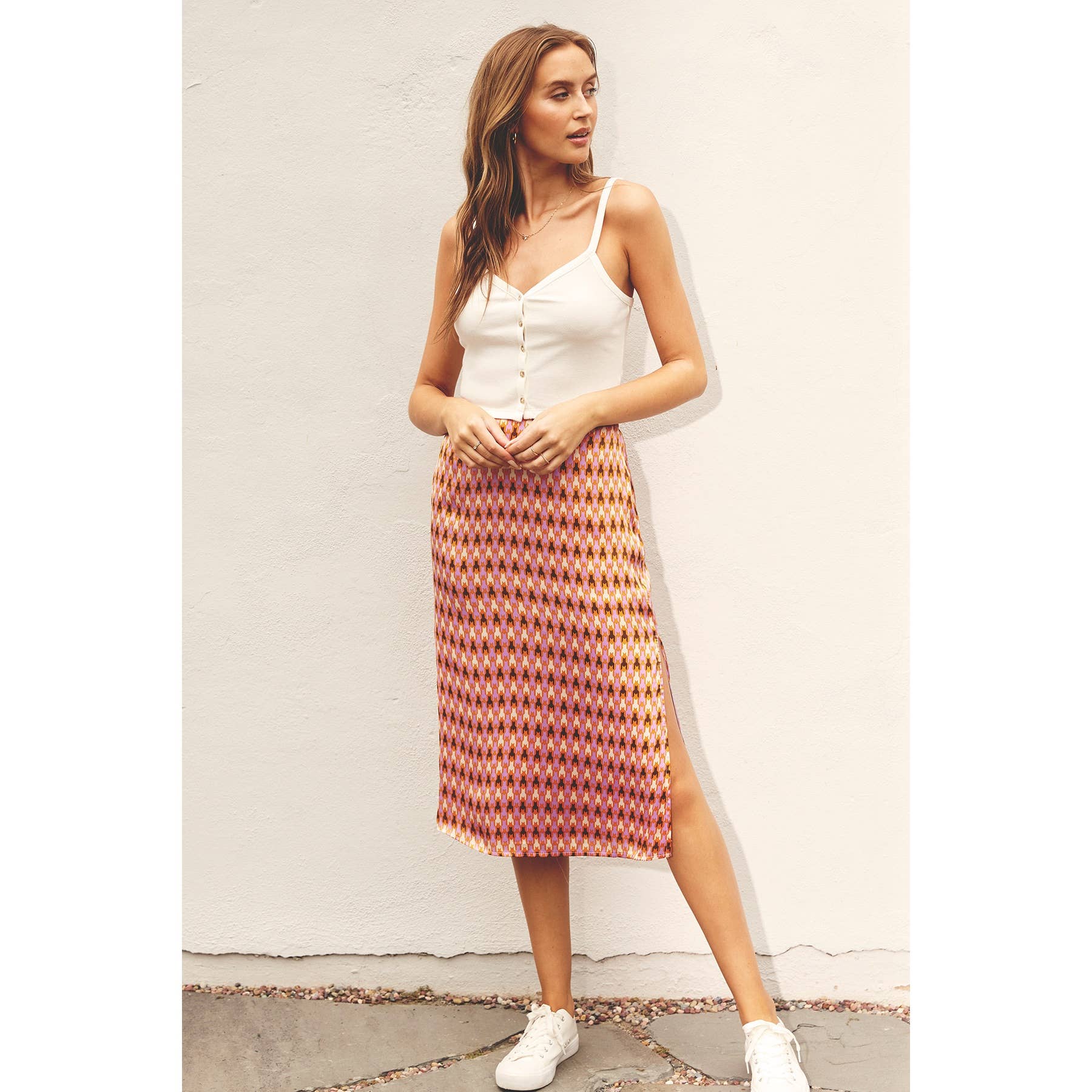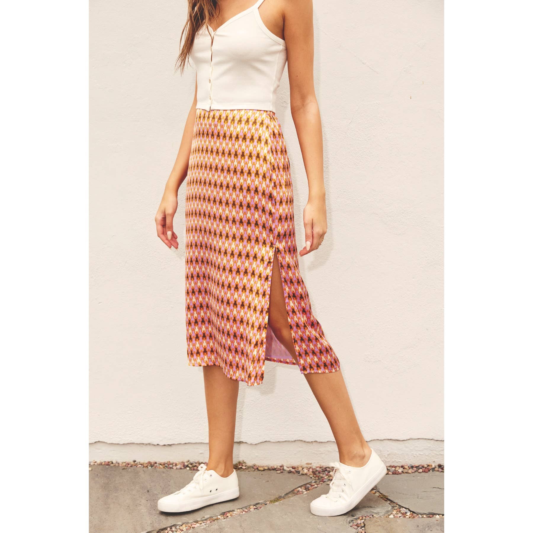 This refined midi skirt in ROSEY MOCHA features a long side slit and an elasticized back waistband with a concealed zipper closure. Designed for versatile wear throughout the year, it effortlessly transitions from day to night styles. Pair it with sweaters, jackets, sneakers, or heels to create countless looks. Fully lined for a comfortable fit, it follows true-to-size measurements. The model stands 5'10" and is dressed in size Small. Both shell and lining are made of 100% polyester.
