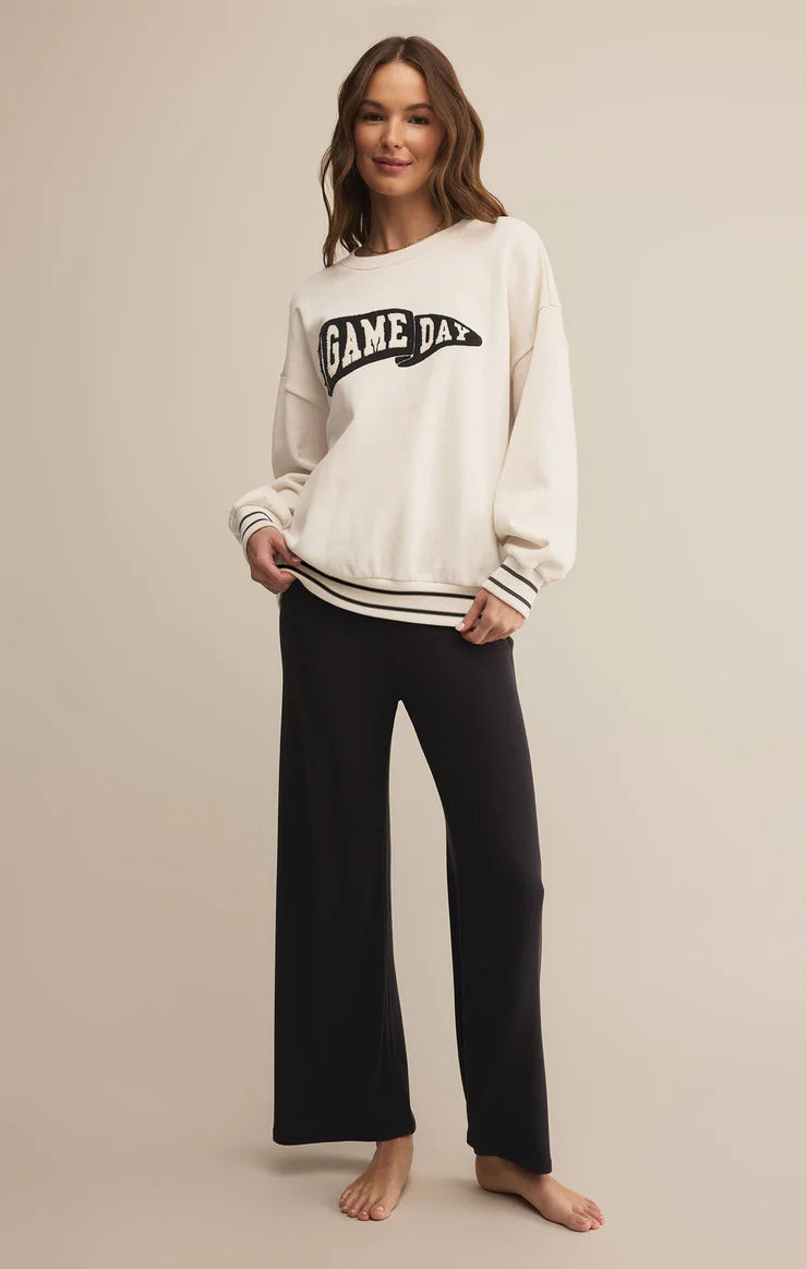 This oversized crewneck brings laid-back vibes with soft fleece and a comfy midweight feel. Featuring bold “Game Day” flag boucle and embroidered artwork, it’s the layer you’ll want for every kickoff and casual hang.