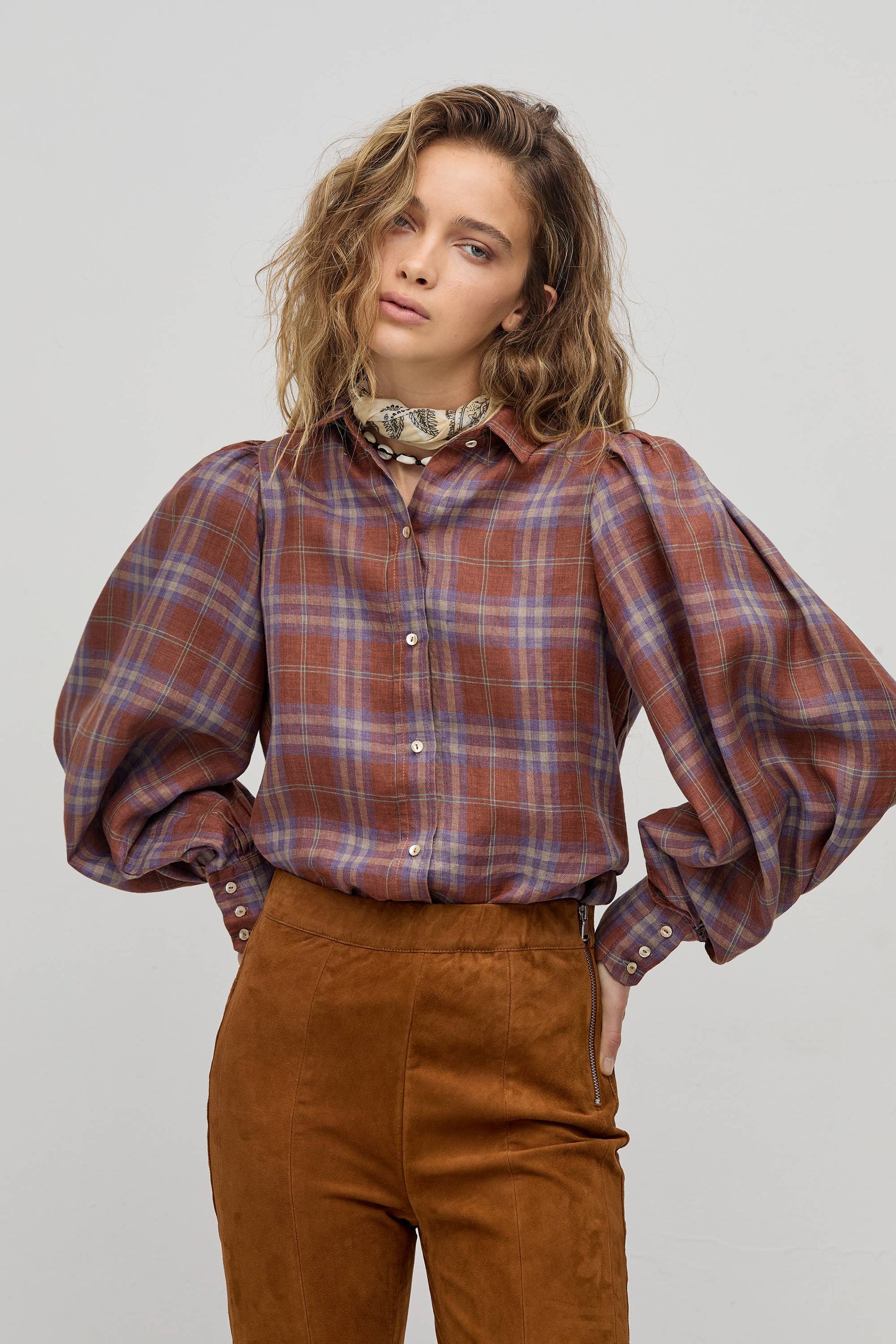 Perfect for wearing in all seasons, the Camille is made from our spectacular 100% natural, pre-washed, and softened linen. This garment is very feminine: it has voluminous sleeves and cuffs that cinch with a wavy finish for a romantic touch. The hazelnut check pattern is absolutely gorgeous, making it one of the favorite pieces in this collection. With a classic shirt collar, front mother-of-pearl buttons, and a curved hem that’s a little longer in the back.