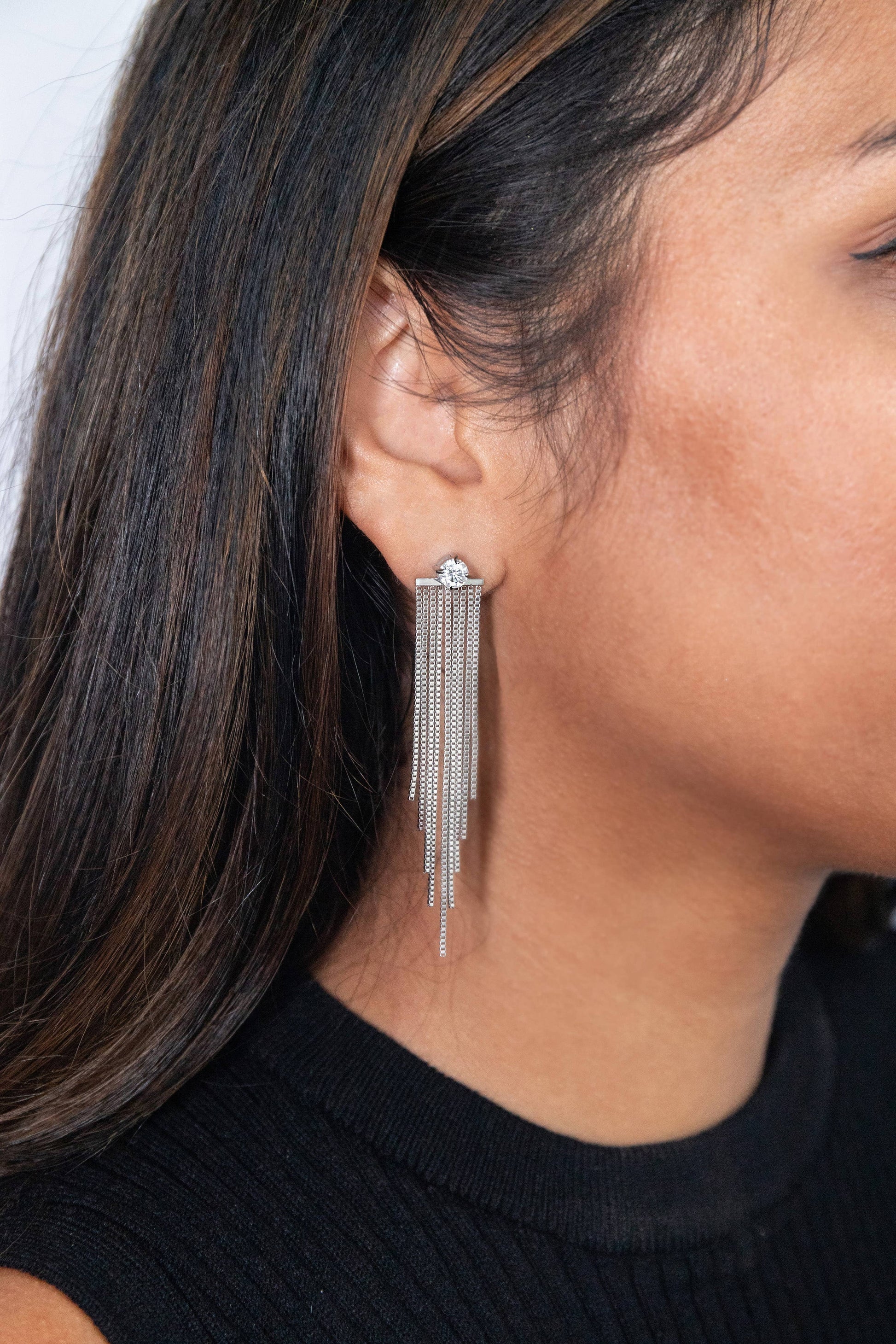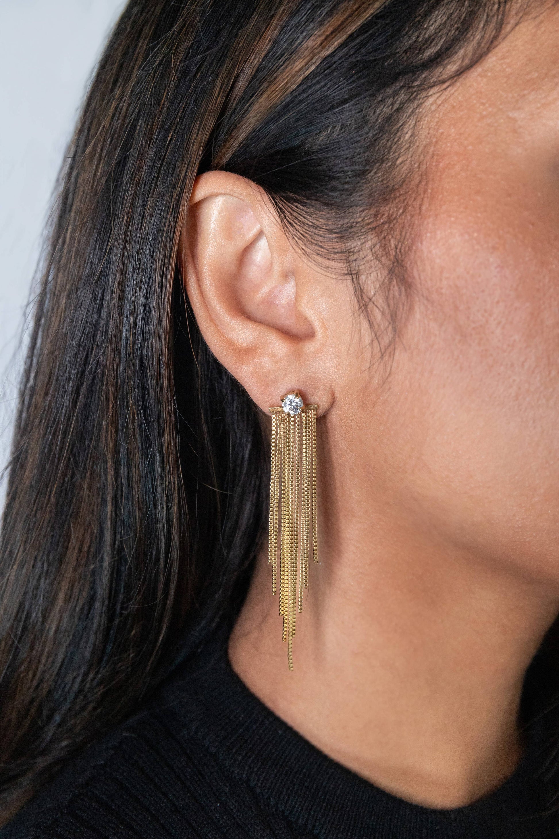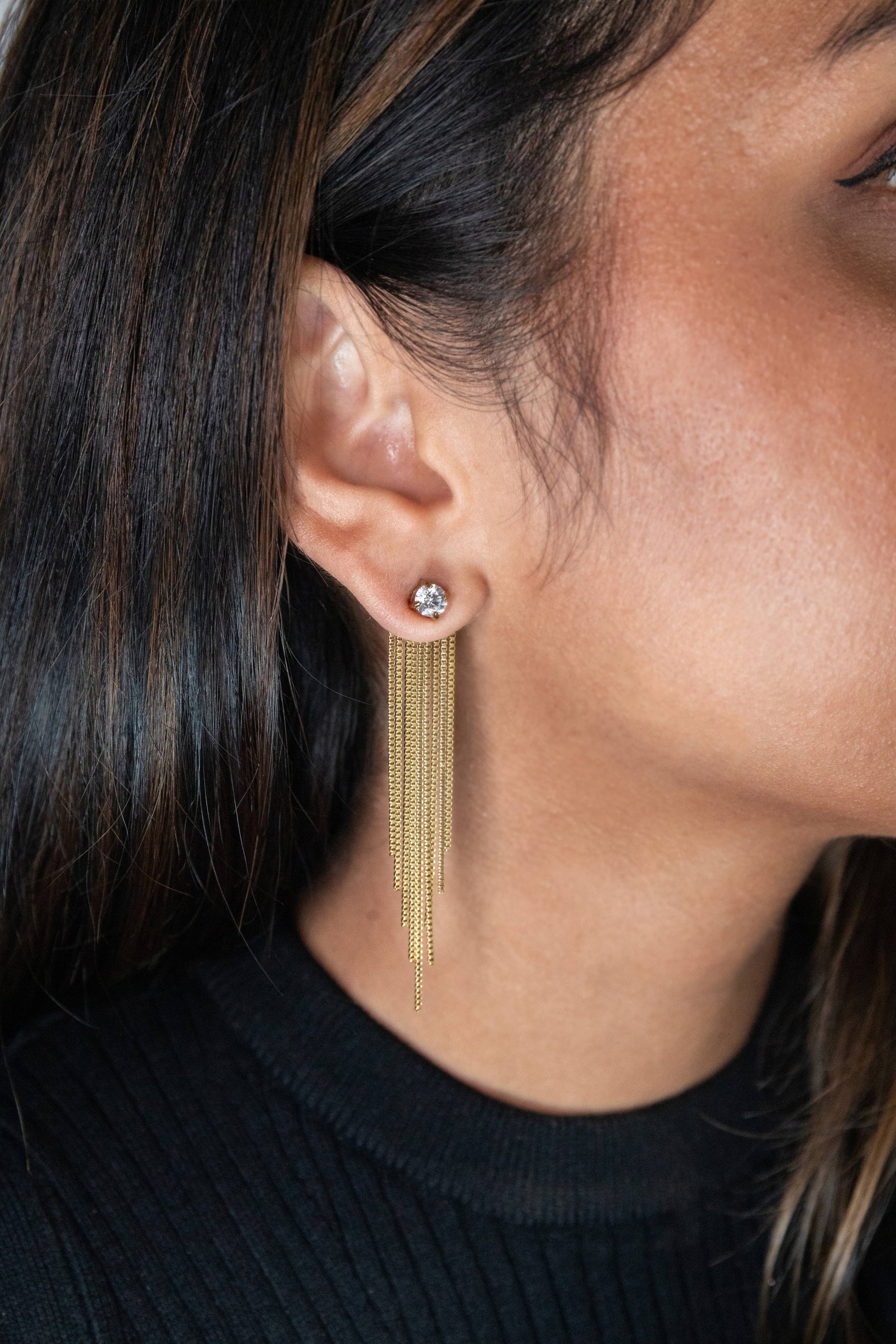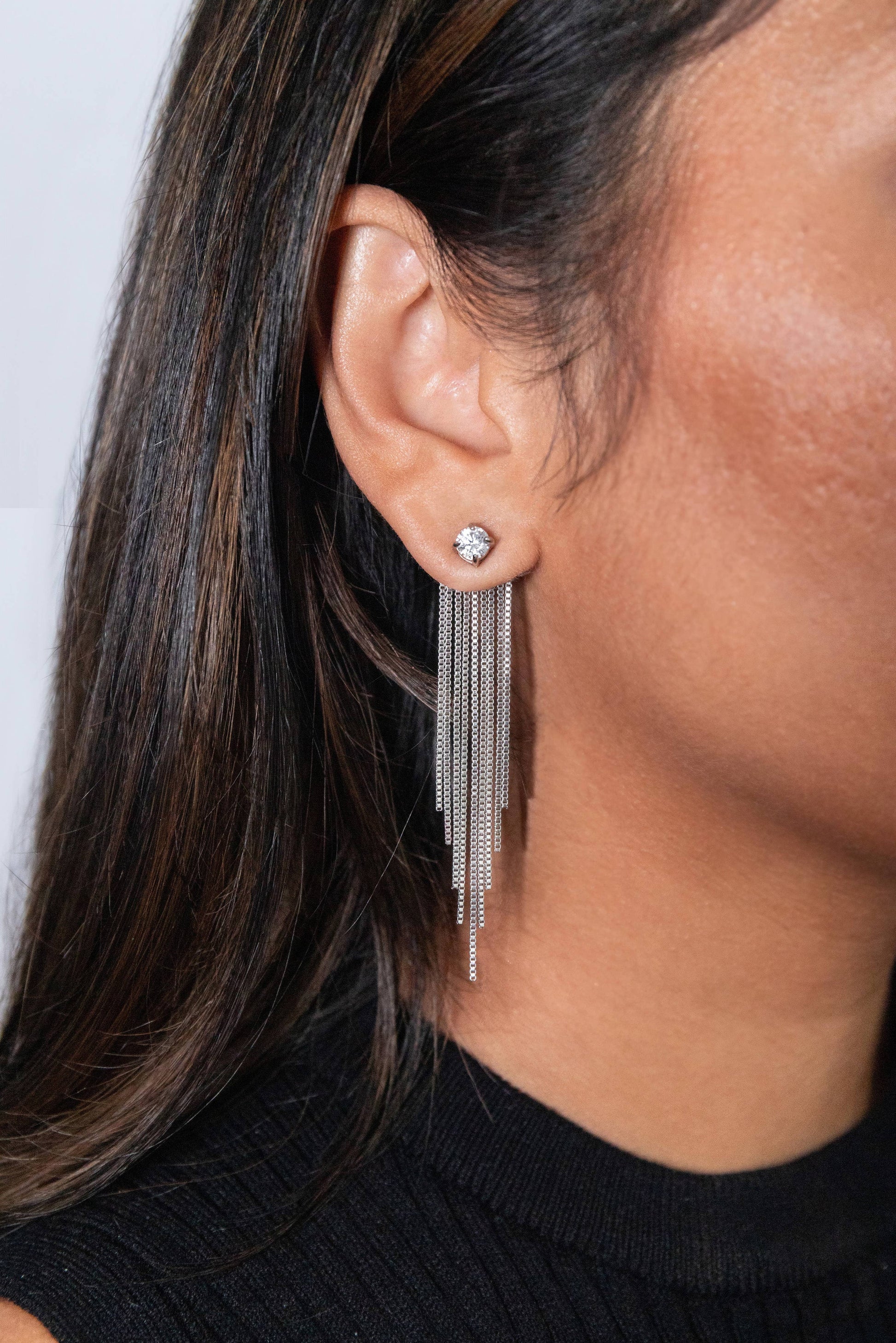 Because every body needs a staple diamond stud earring — with fringe. Meet the newest member of the Blair Collection — a 5mm simulated diamond stud, embellished with a removable fringe ear jacket in our signature 'Nile' box chain. Also available in both 3mm and 4mm diameter, our simulated diamond Blair Stud earrings scream luxury without breaking the bank. Guaranteed non-tarnish, hypoallergenic, rust-resistant, and water-resistant — Blair is crafted of the most exceptional materials, and engraved with our signature logo — so you know they're real. Perfect for wearing on their own, layering multiple sizes together for girlies with multiple ear piercings, or adding the fringe ear jacket for a dramatic chandelier effect — the Lia Drops are the most versatile earring for any season.