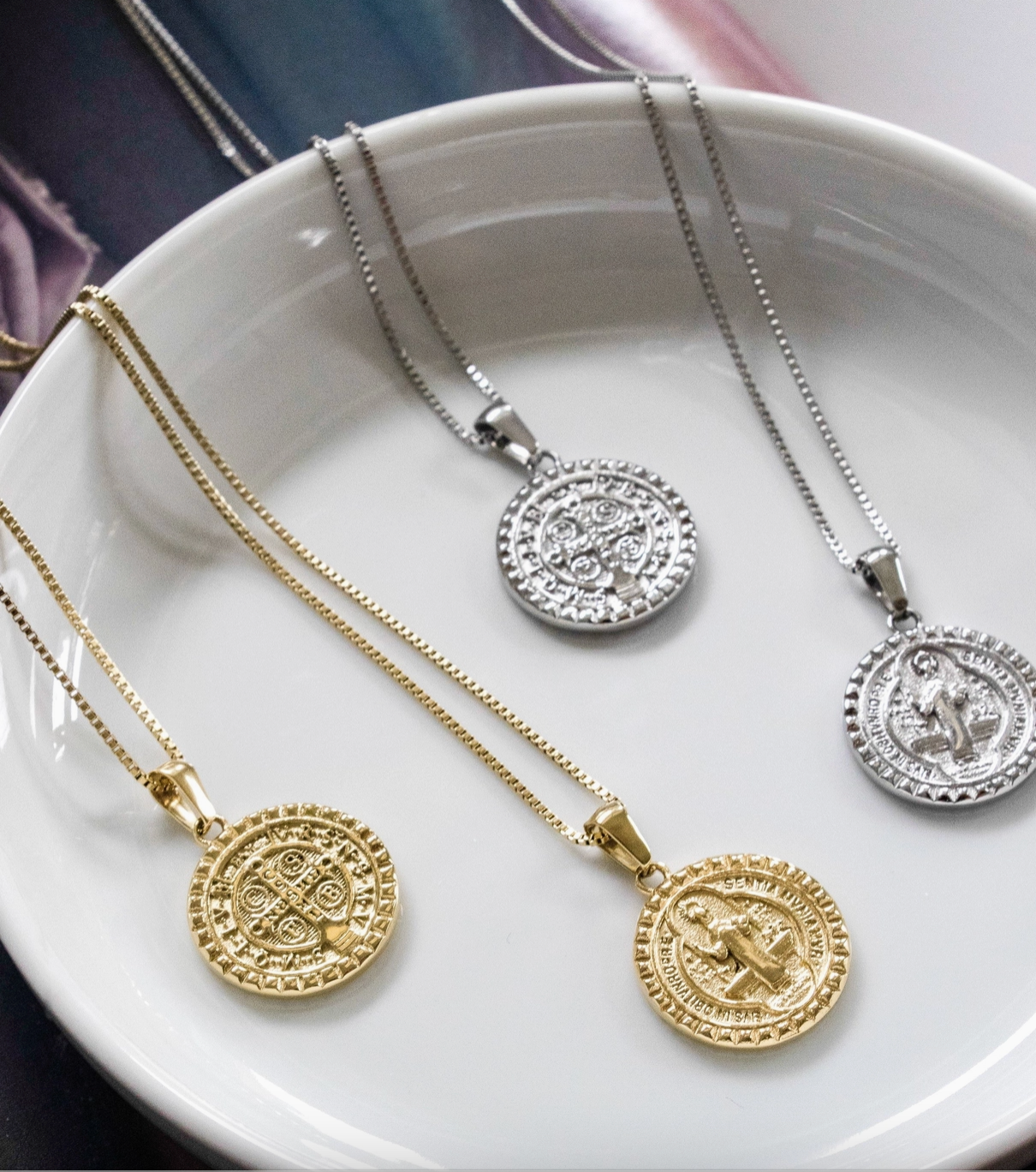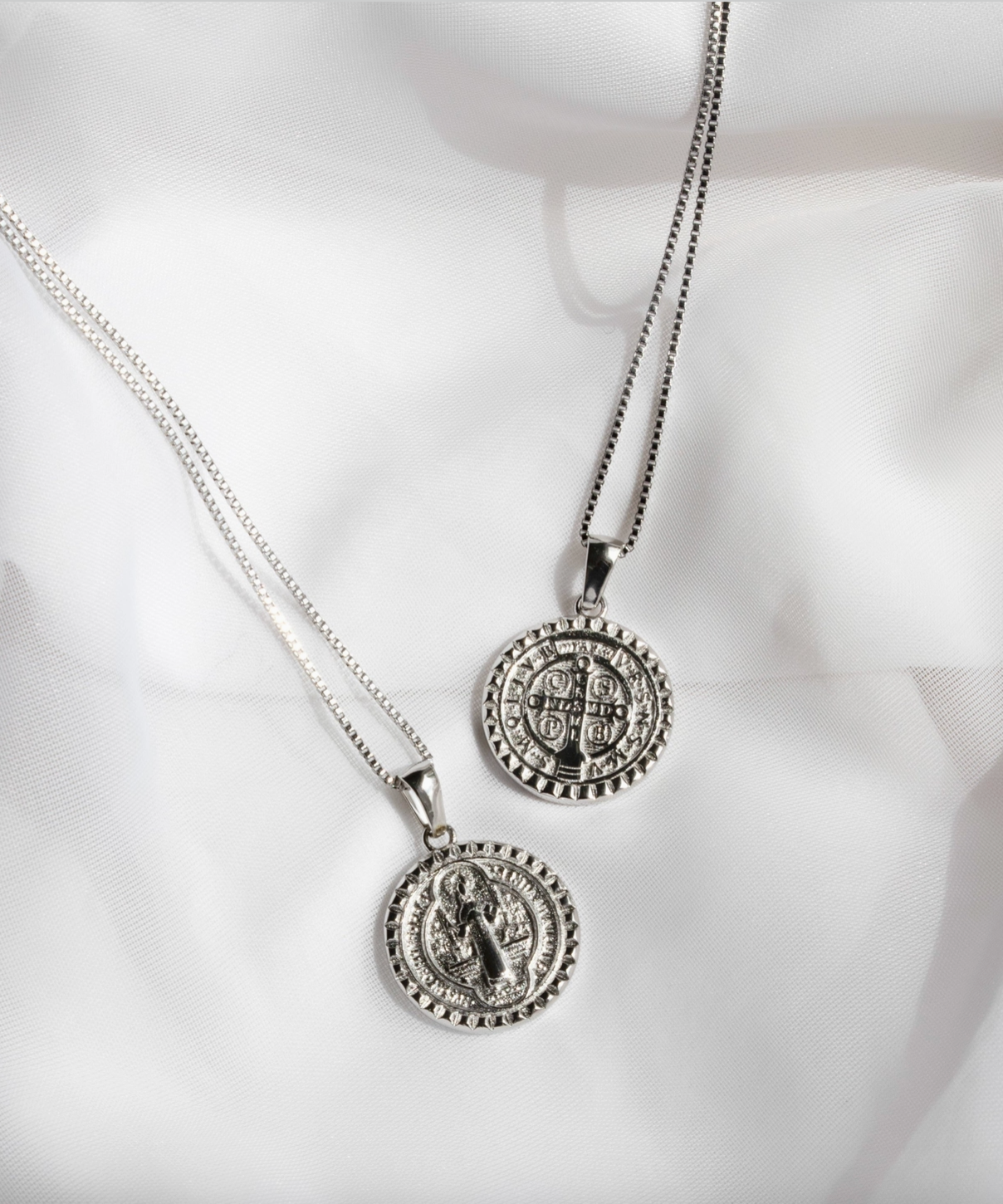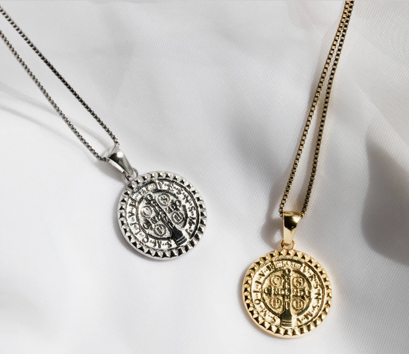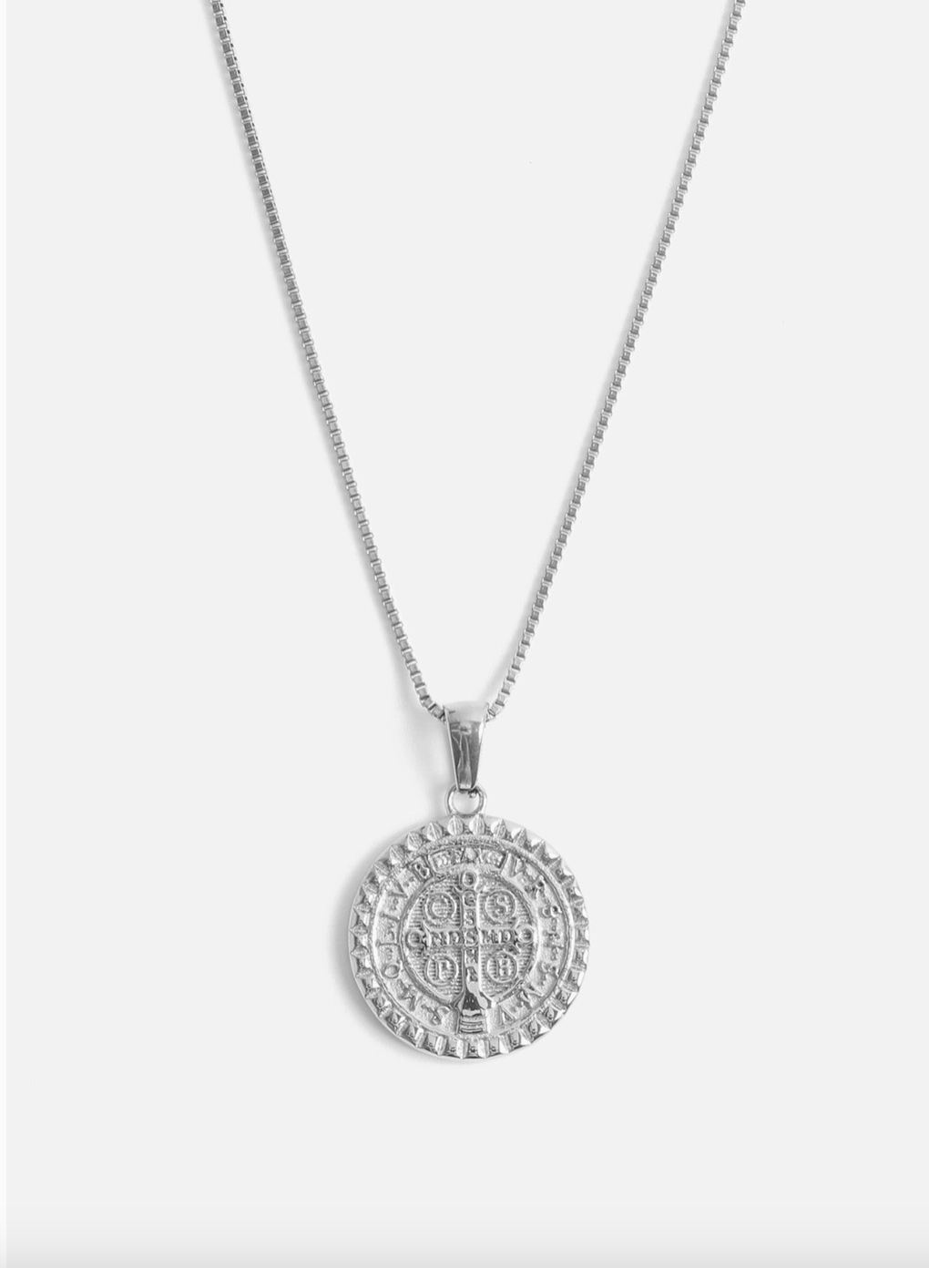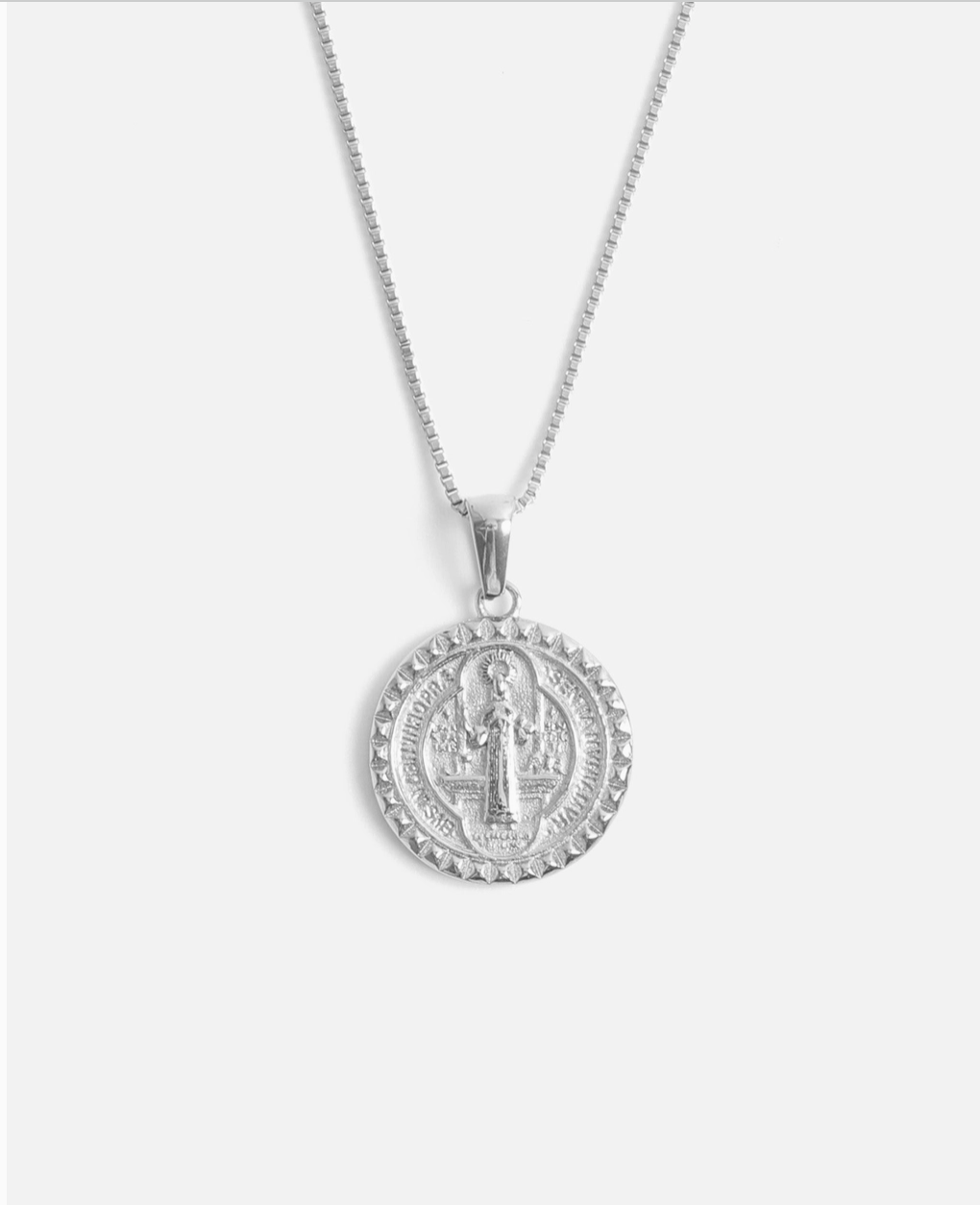 A reversible round charm featuring St. Benedict on one side and a cross on the other, the Oro Pendant is finished with our signature spike-inspired Melrose border motif, that can be found across the collection in styles like the Melrose Band and our Zodiac Collection. Representing protection and prayer, especially during challenging times, the iconography embedded into this piece represents opening doors, diverting difficult paths, and protecting good health. Finished with a delicate and signature MC box chain with an added extender.