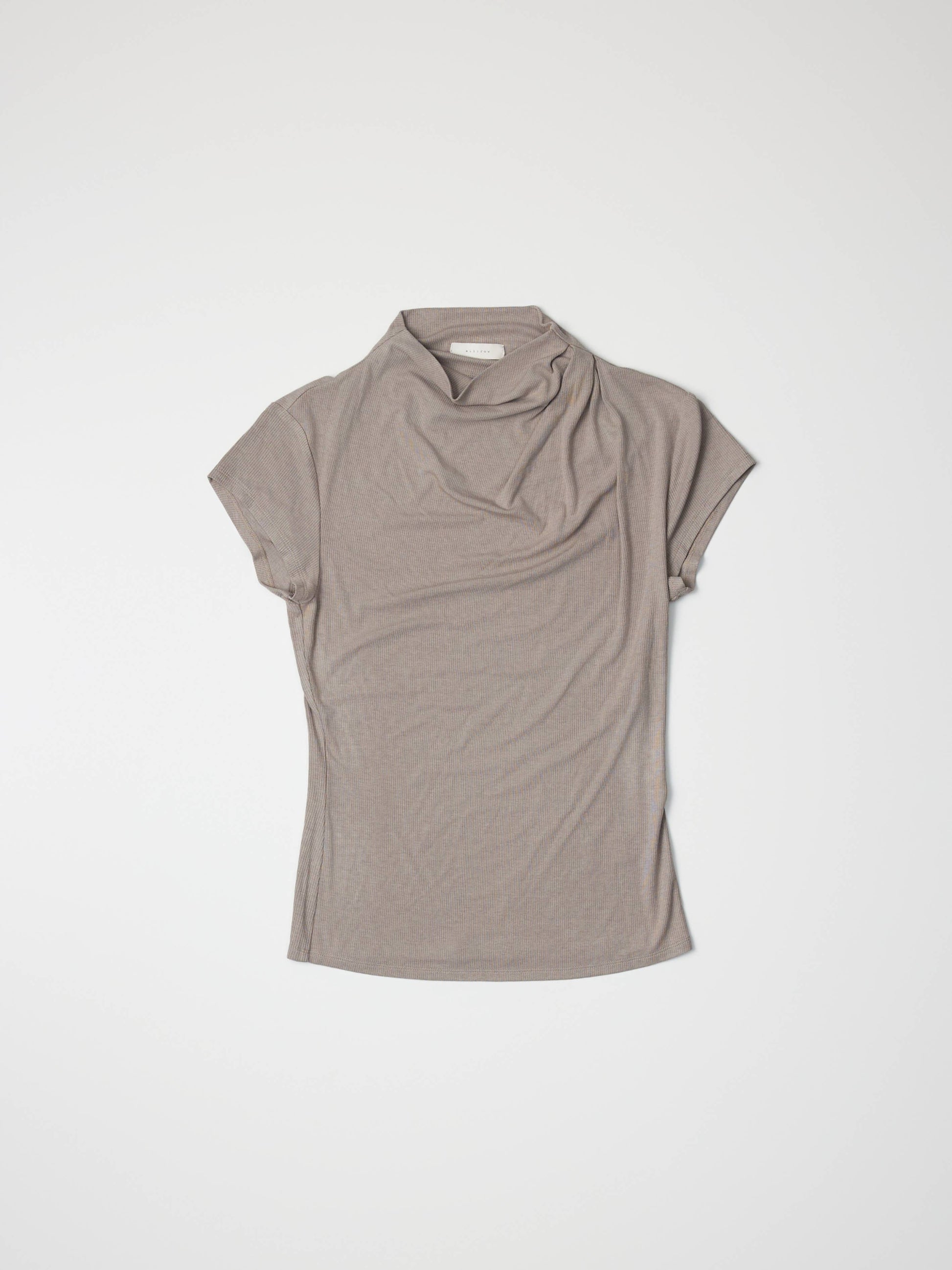 The Marissa Top is a form-fitting ribbed knit top that features a mock cowl neck and subtle shoulder pleating for added texture. With cap sleeves and a sleek silhouette, it offers a modern, refined look.