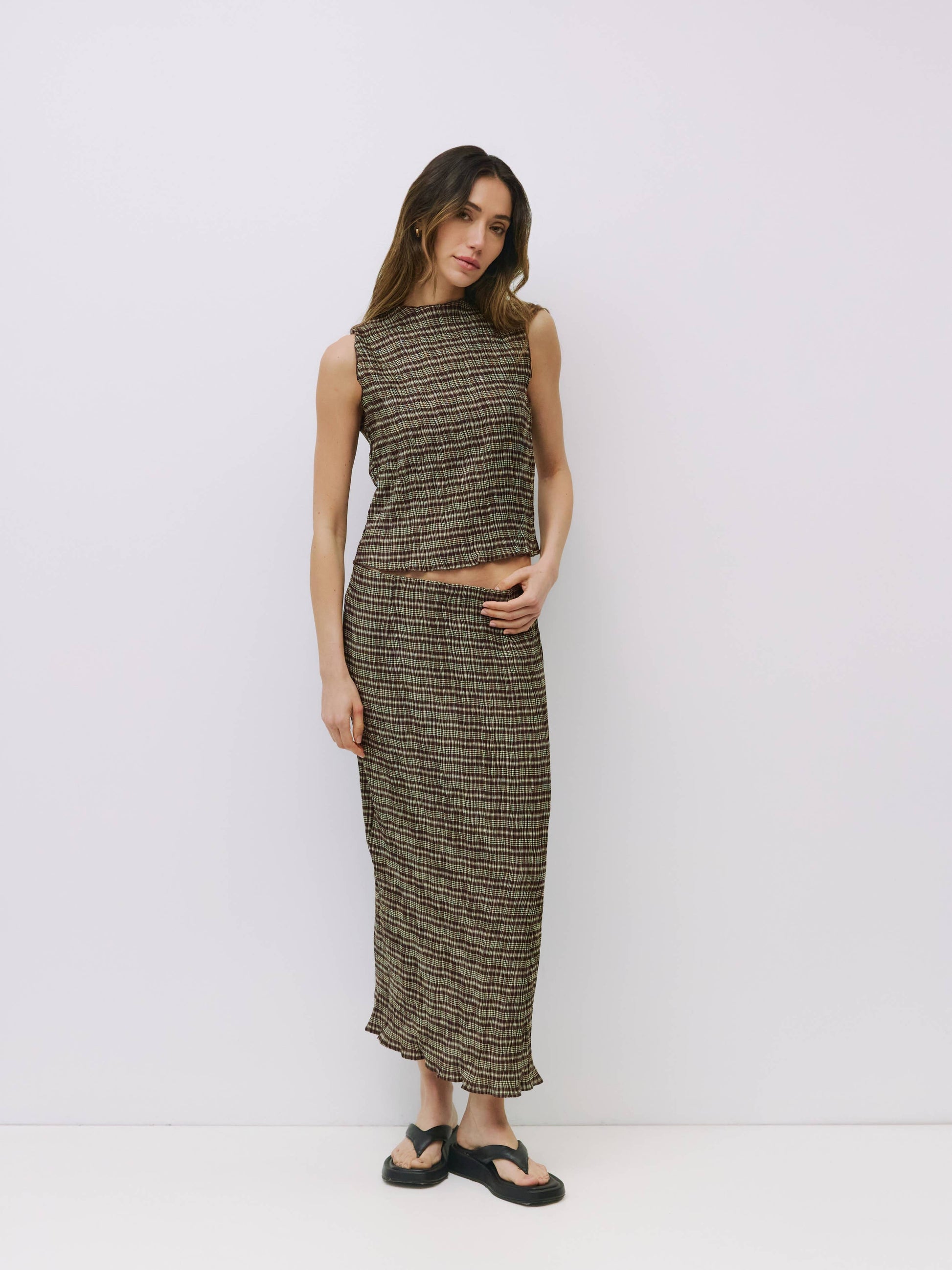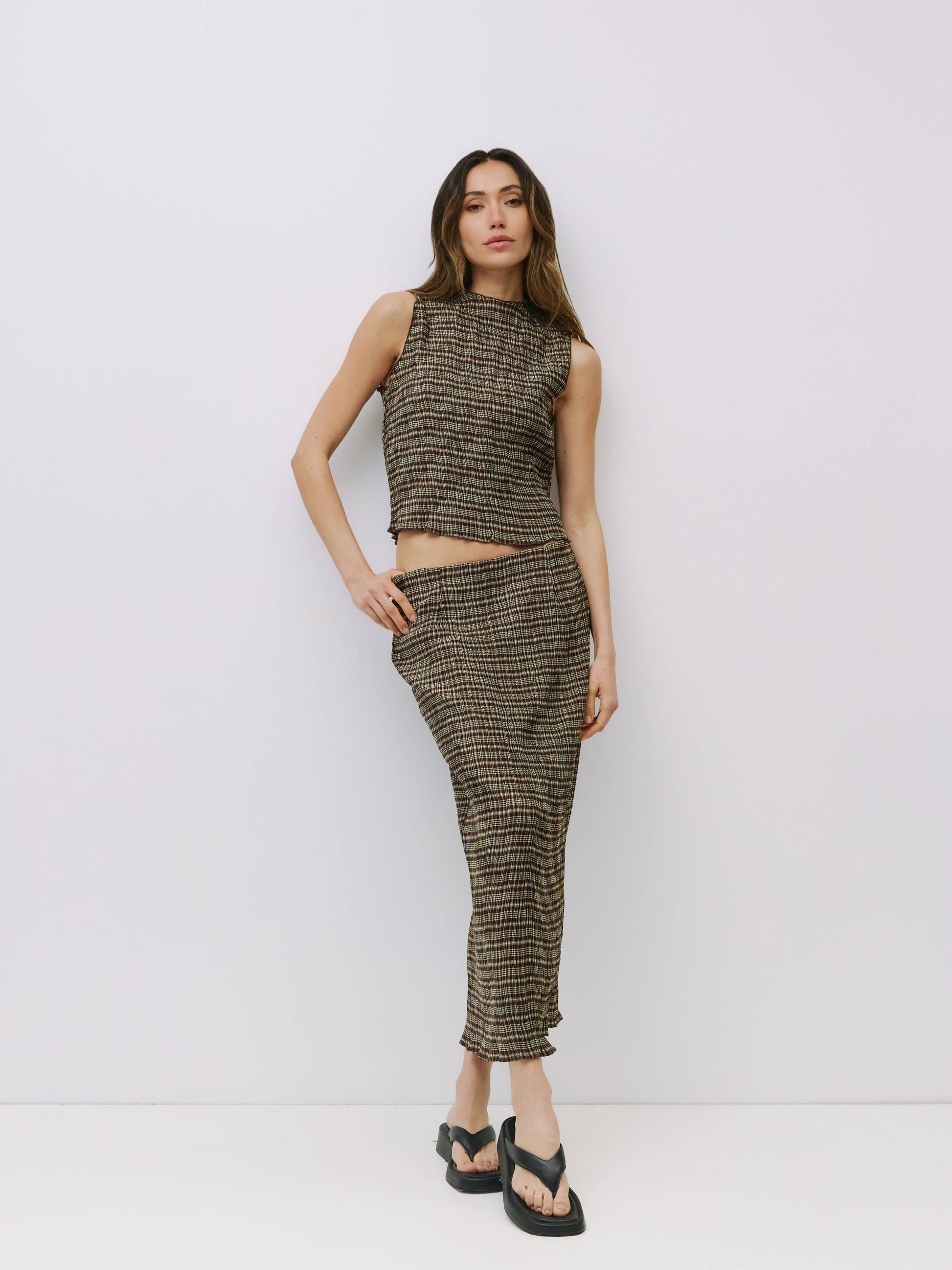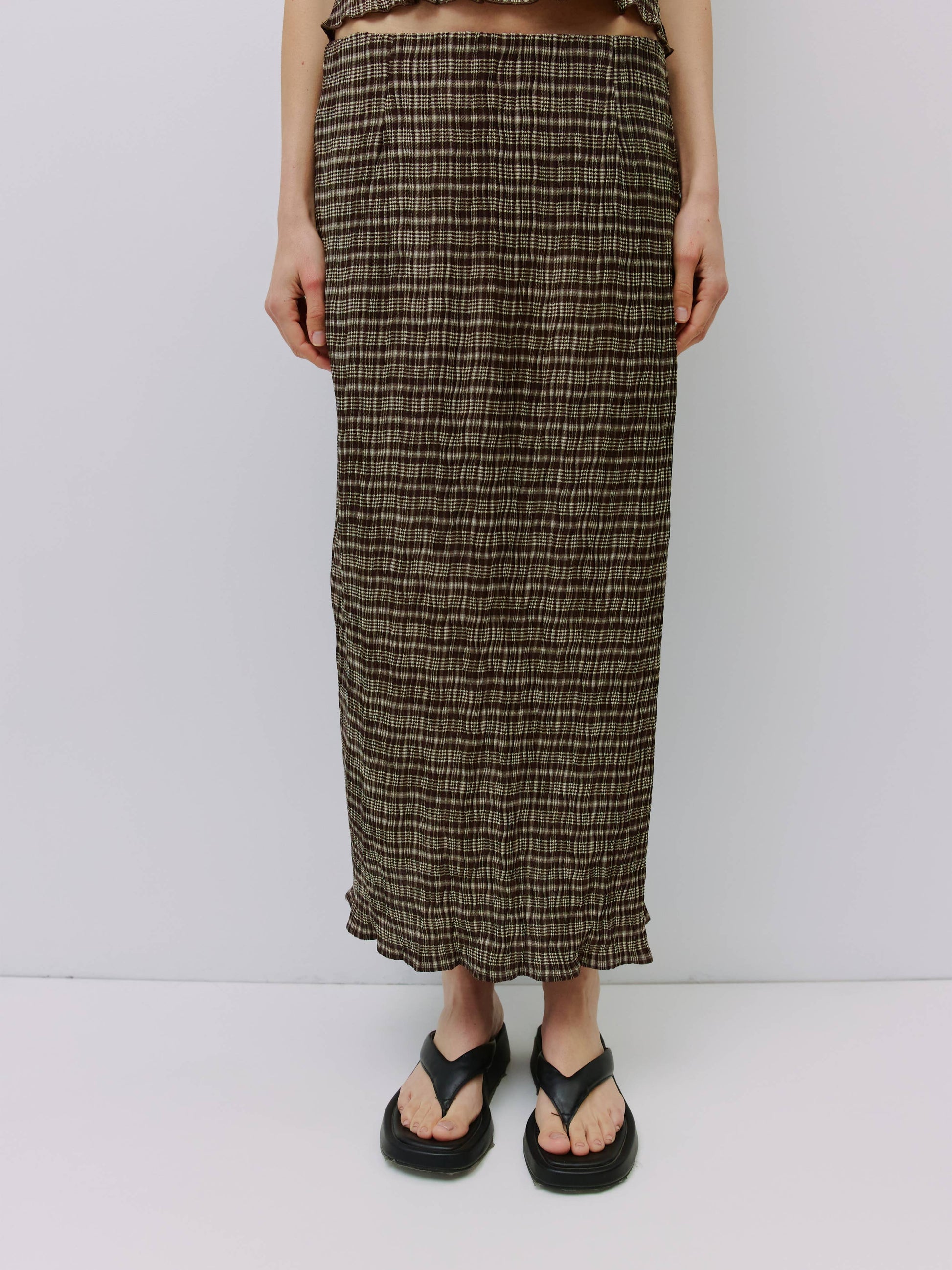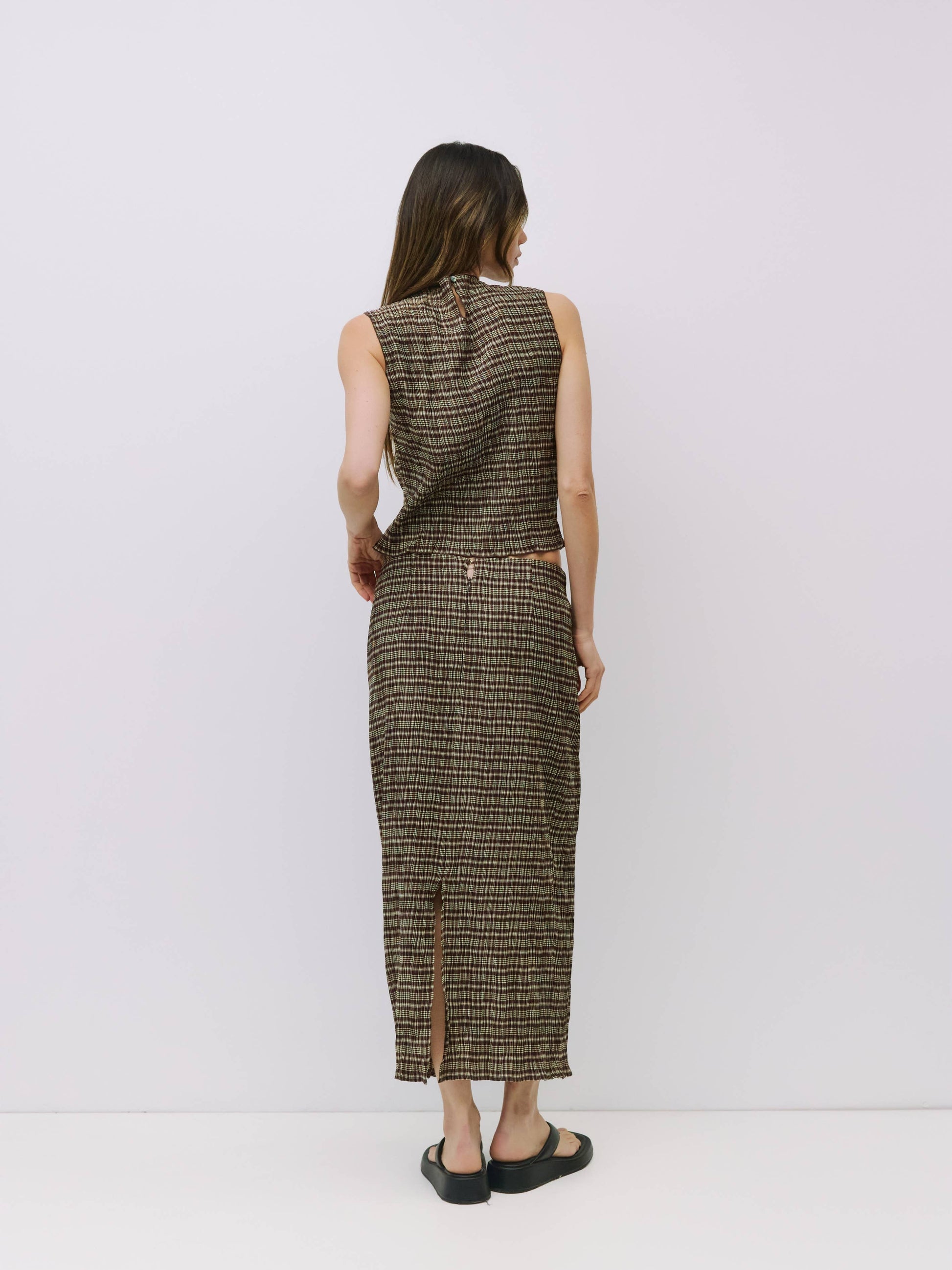 The Sab Skirt is a maxi-length piece made from lightweight, textured plaid fabric for an easy, breezy fit. The back slit and invisible zipper closure add a modern touch, making it versatile for both casual and dressed-up looks.