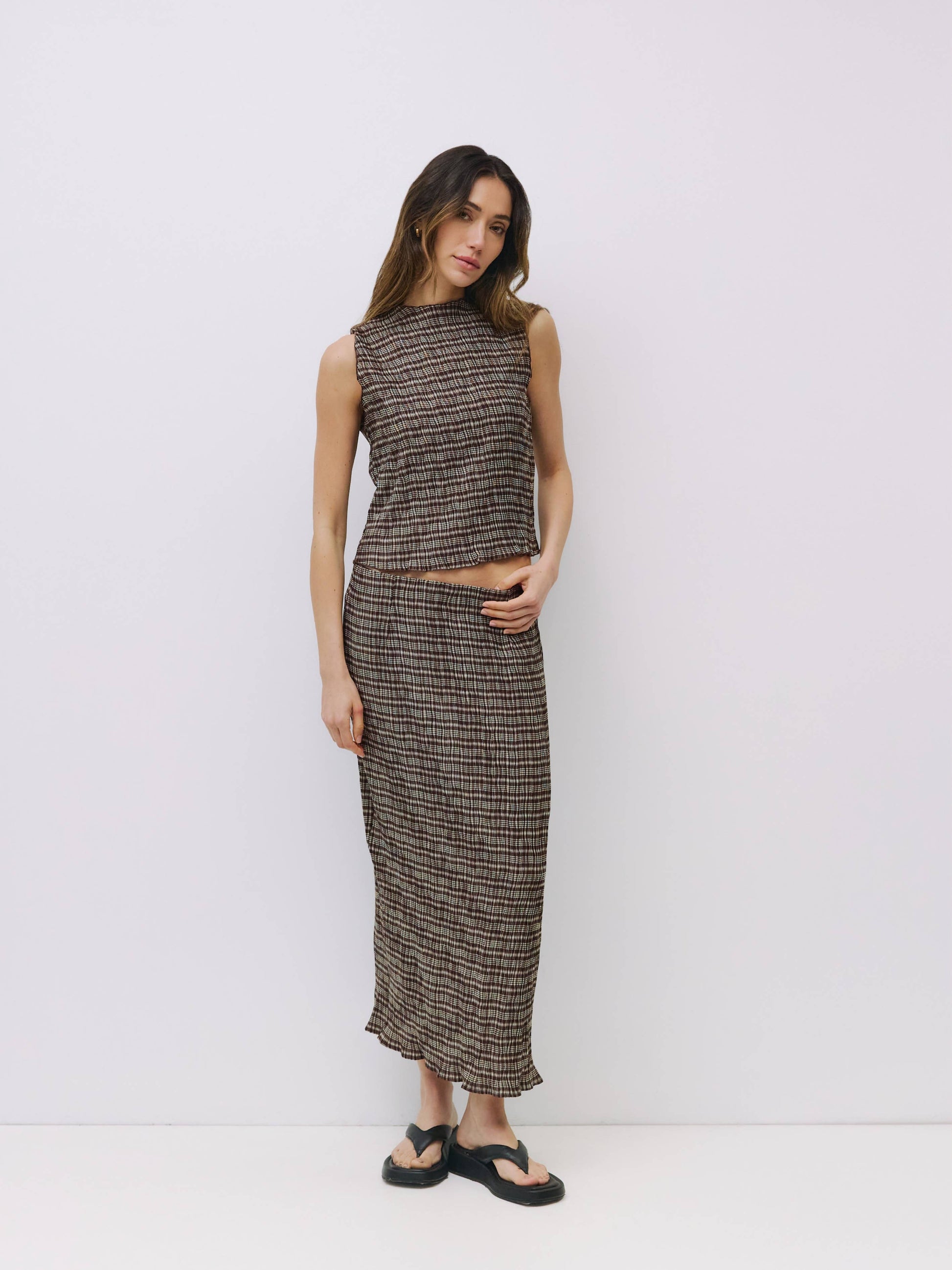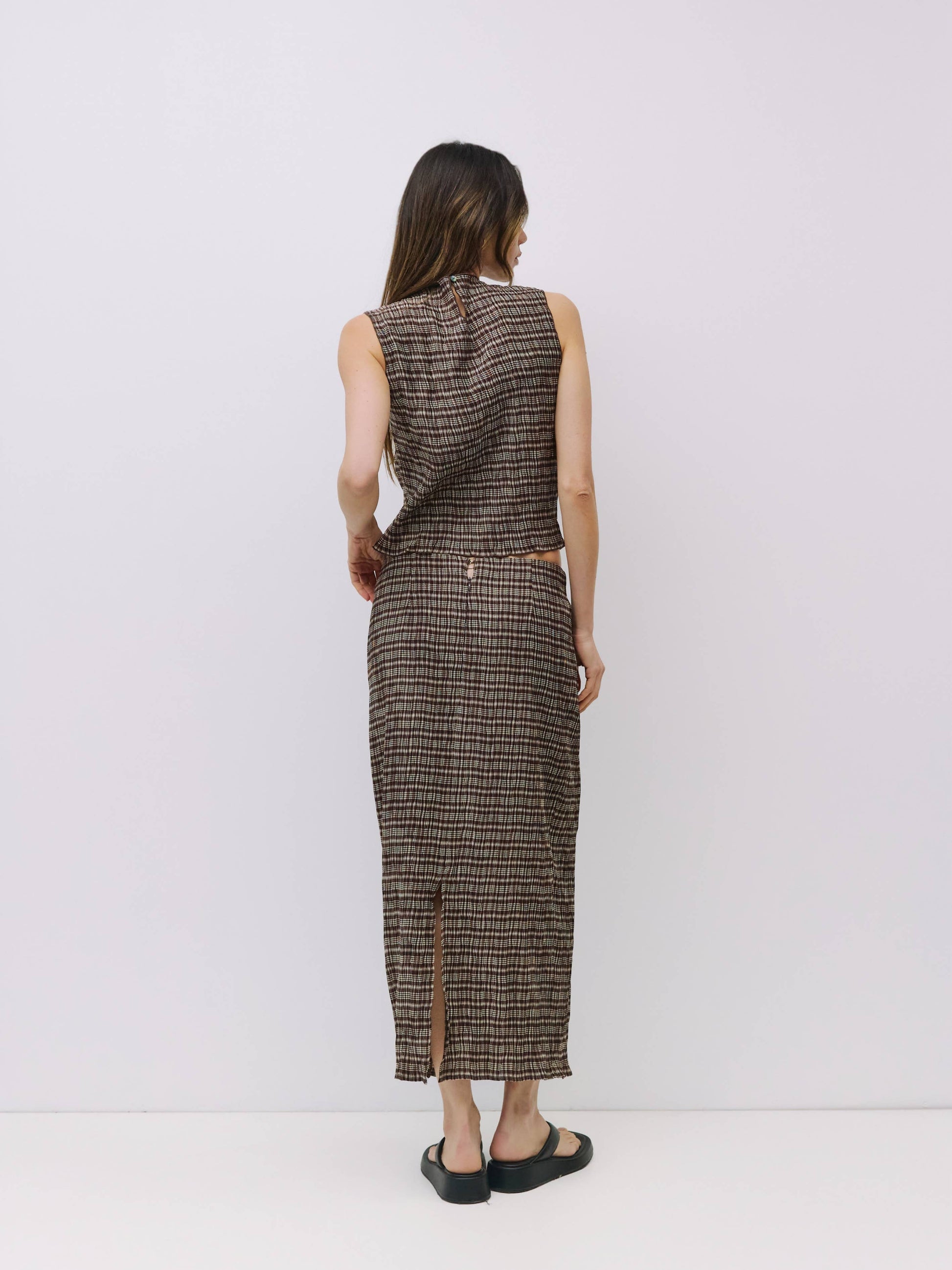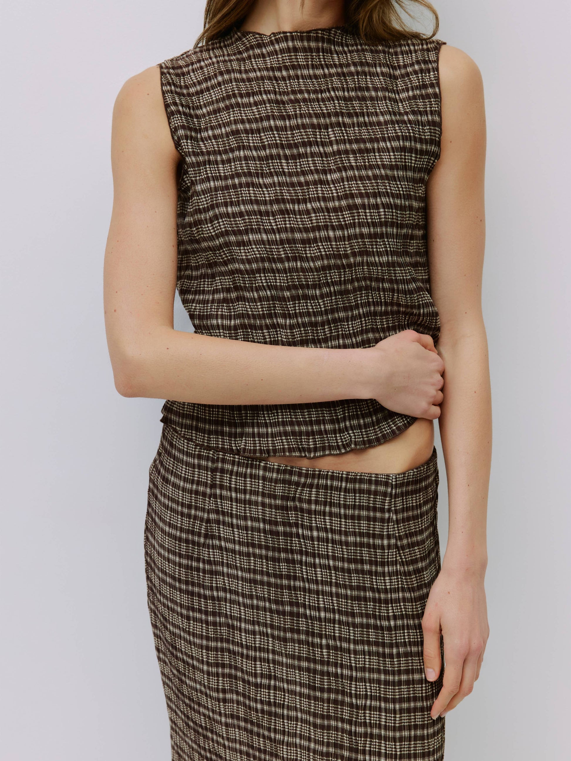The Sab Top is made from lightweight textured fabric, offering a relaxed and breathable fit. The merrow edge finish on the neckline, sleeves, and bottom adds a modern touch, while the back slit and button closure provide a functional detail.