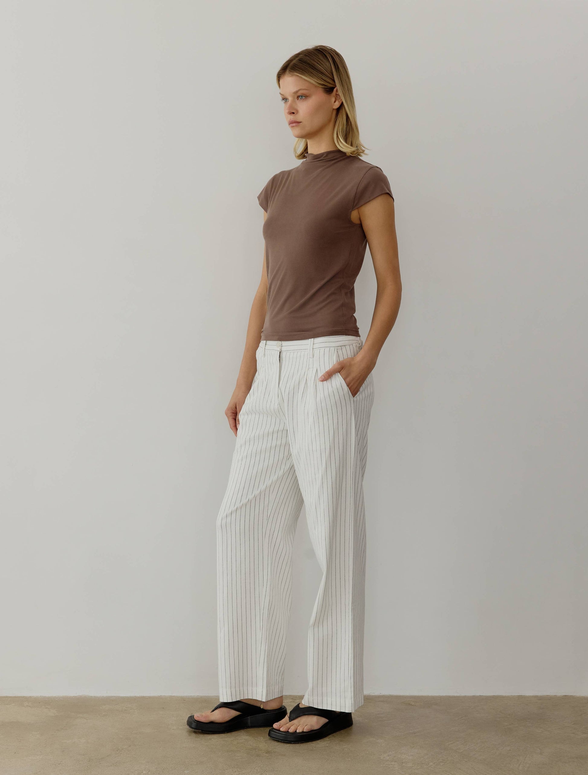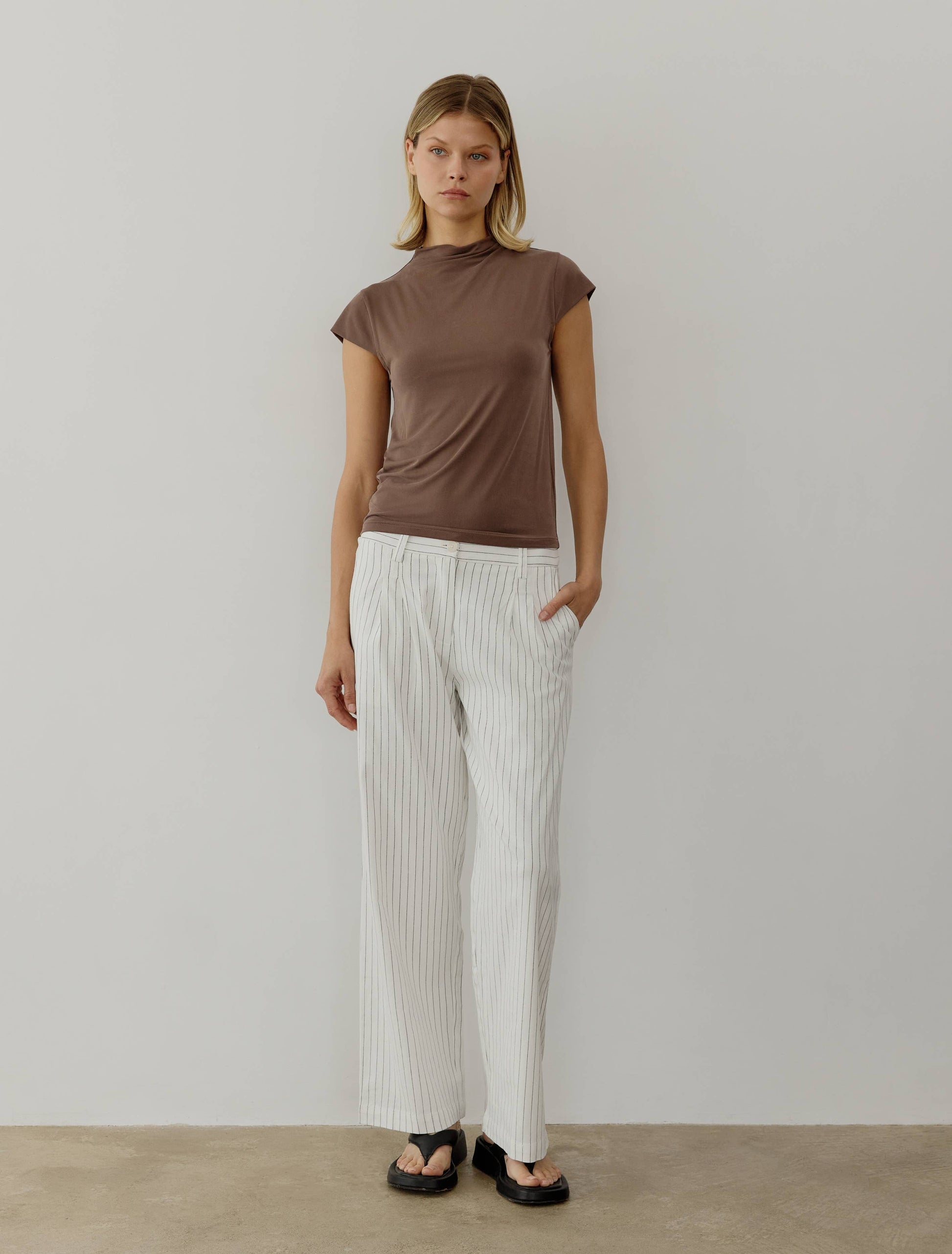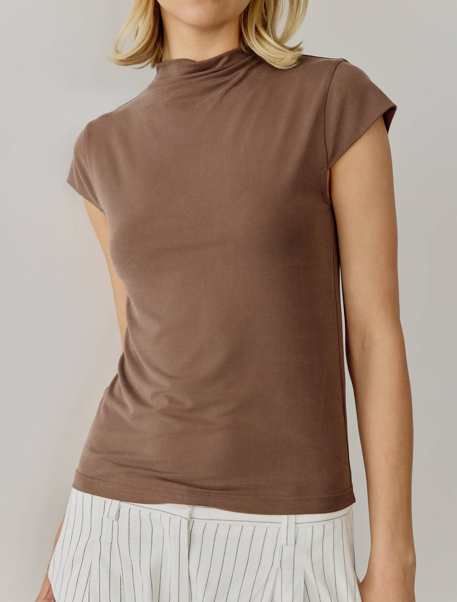 The Vic Top is a double-layered high-neck top with cap sleeves and a semi-fitted bodice, perfect for effortless style for any occasion.