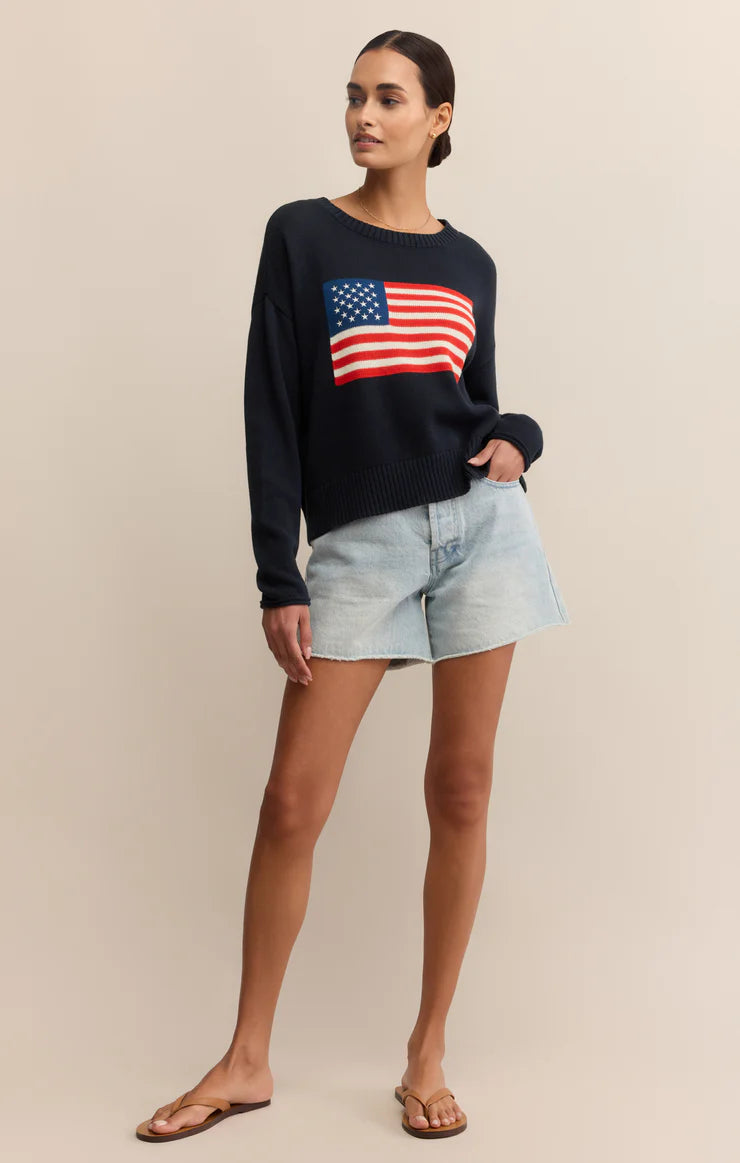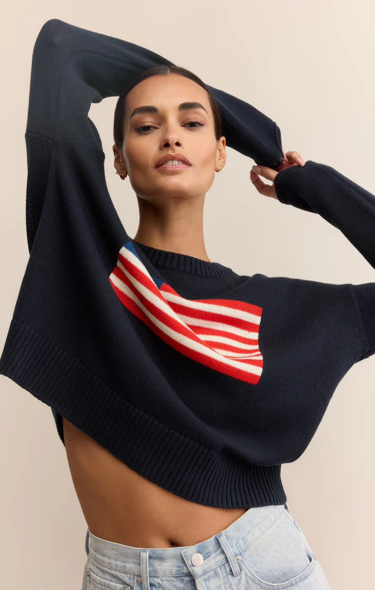 A classic American flag moment, reimagined in intarsia and embroidery for a perfectly vintage-inspired feel. Made from soft, breathable cotton yarns in a relaxed fit, this crewneck sweater is an effortless way to add a little nostalgic charm to your wardrobe. (as seen on Salty Blonde)