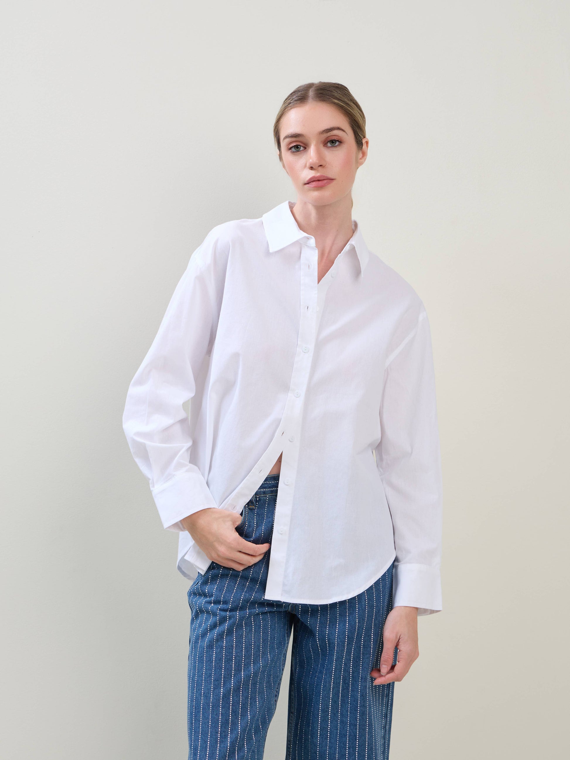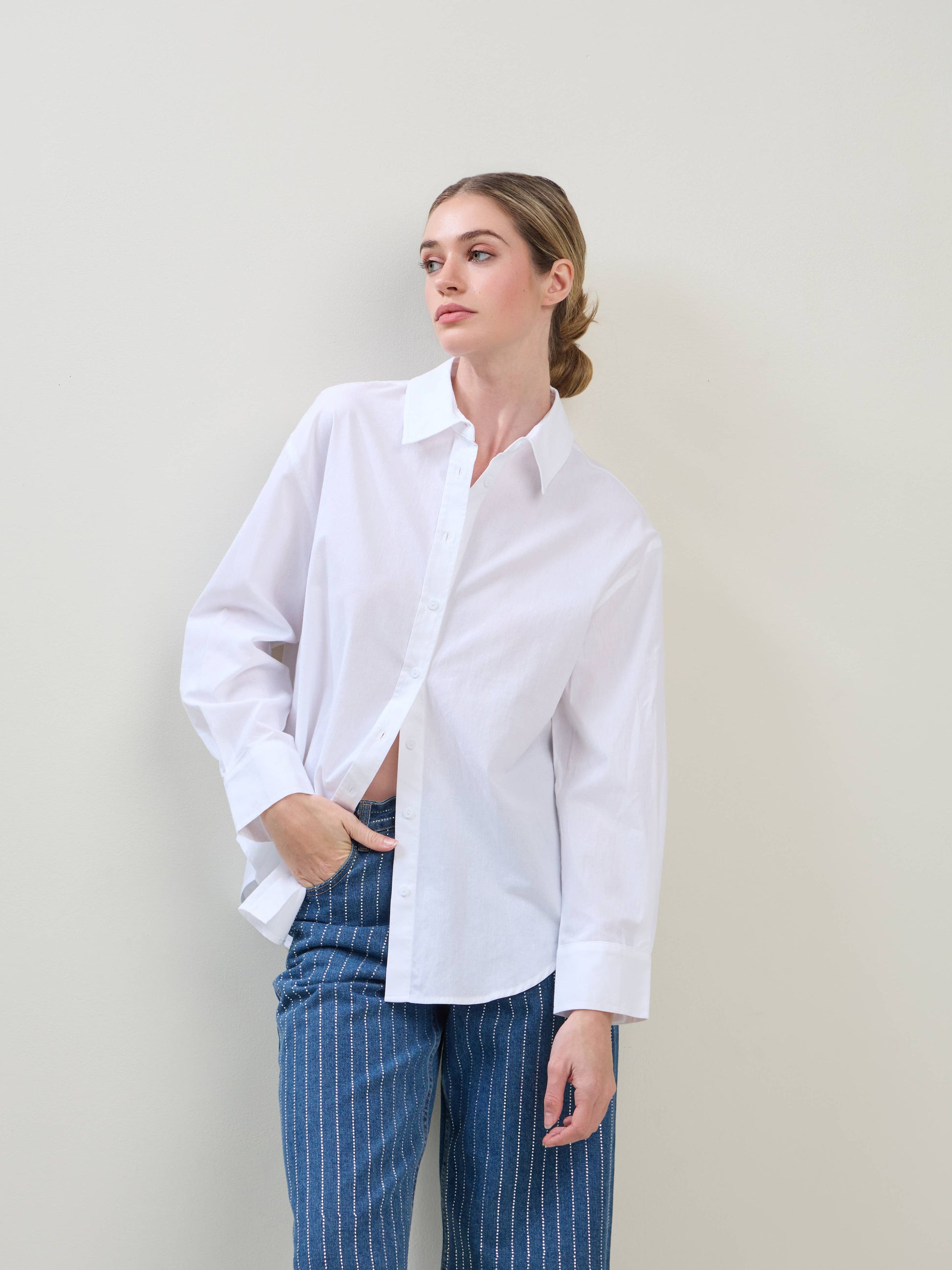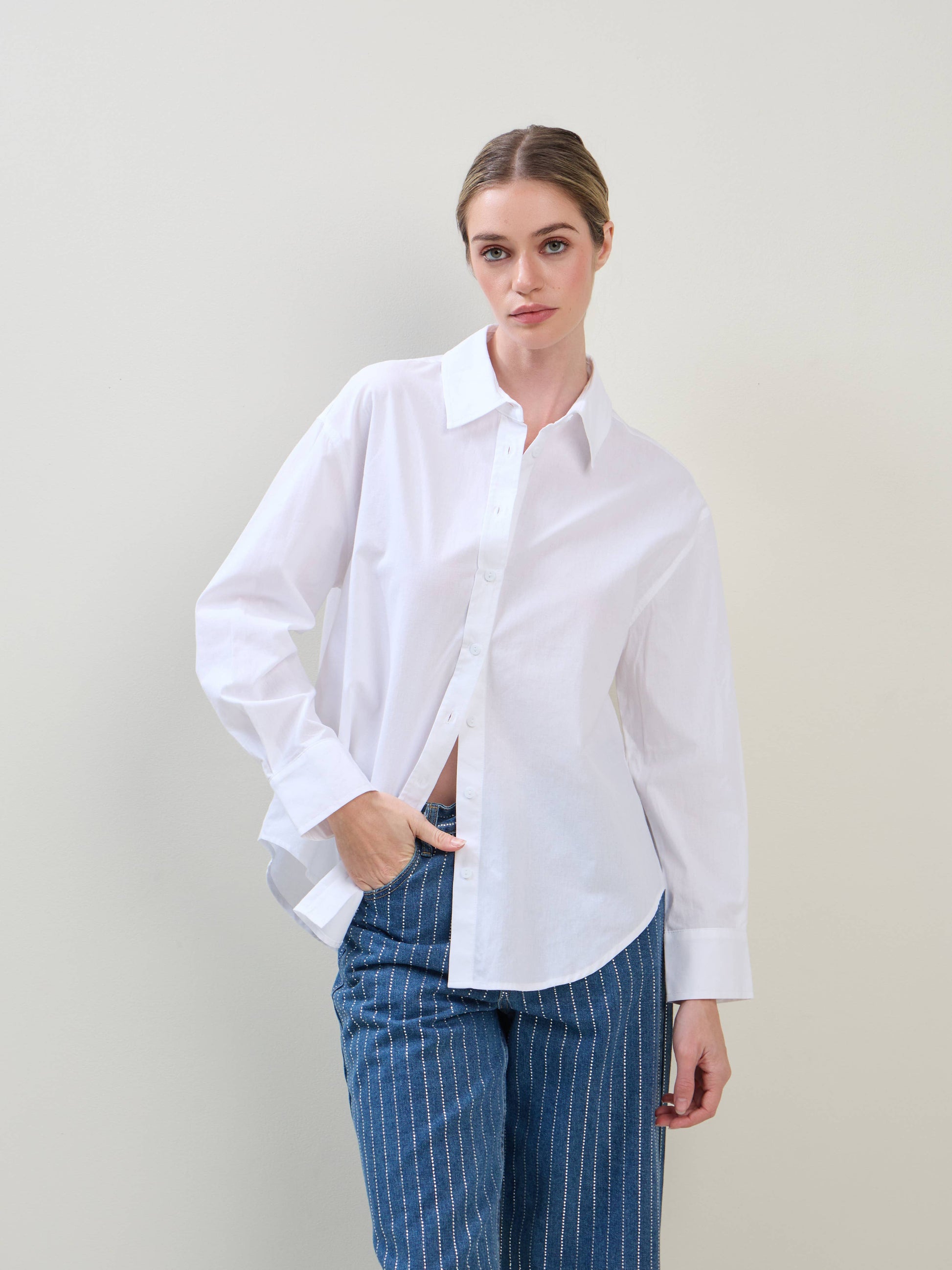 A timeless white button-down shirt that is a wardrobe staple. Crafted from 100% lightweight cotton, it offers comfort and breathability. Ideal for wearing alone or as a layering piece, this shirt fits true to size.